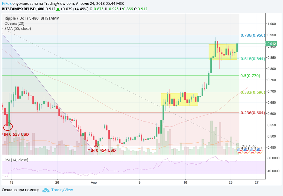 Ripple вчера весь день находился в боковике и сегодня у покупателей на средних объёмах не хватило сил продавить верхнюю границу «прямоугольника». Хотя назвать данный паттерн «прямоугольником» можно только условно, так как перед фигурой отсутствует ярко выраженный экстремум. В виду таких условностей можно ожидать выход из боковика в любом направлении. Бычий пробой превысит уровень 78.6% фибо (0.950 USD), а при снижении цены, пара XRP/USD протестирует уровень 0.800 USD.