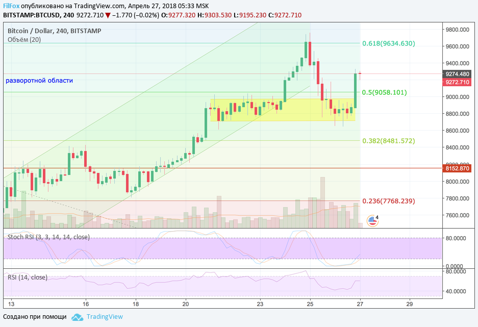 Вчера цена Bitcoin весь день провела в боковом диапазоне «прямоугольника». Сегодня консолидация закончилась, первый же бычий импульс пробил верхнюю границу диапазона и вынес цену выше уровня 50% фибо (9058.00 USD) в район отметки 9300.00 USD.