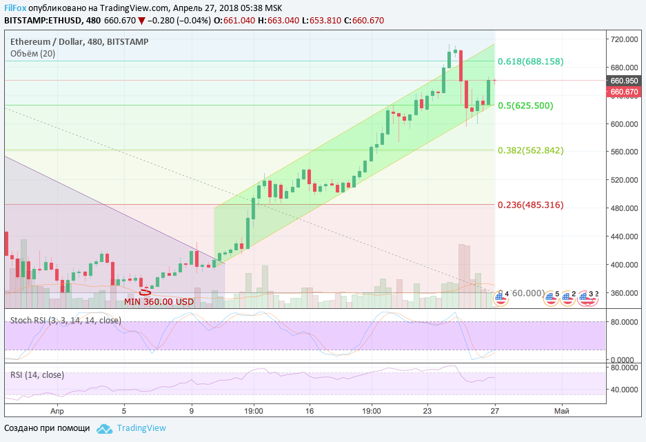 Ethereum вчера консолидировался на уровне 50% фибо (625.50 USD) и сегодня, так же как на графике цены BTC/USD, мы увидели бычий импульс на средних объёмах покупок, который восстановил цену до уровня 660.00 USD.