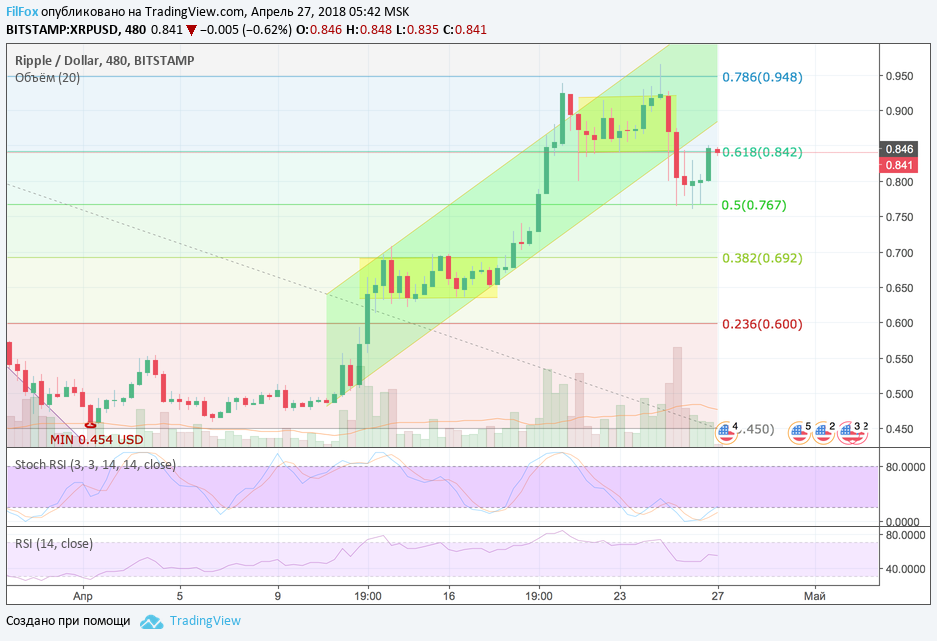 Вчера Ripple консолидировался в довольно широком диапазоне, вдоль средней линии на отметке 0.800 USD. Диапазон консолидации был настолько широким, что сегодняшний бычий импульс выглядит как ре-тест верхней границы этого диапазона. И если сегодня у пары BTC/USD не предвидится сильных импульсов, то полагаем, что рипл продолжит биться в этих же пределах, пока одна из границ всё-таки не выдержит и «провалится».