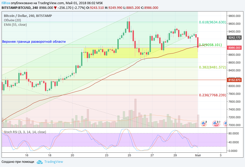 Полагаем, что медведям всё-таки получится продавить цену в зону консолидации прямоугольника. Но как долго цена сможет продержаться в желтой зоне - пока не ясно. При показаниях индикатора стохастика на снижение, цена в ближайшее время сможет пробить нижнюю границу коридора консолидации и протестировать уровень поддержки 38.2% фибо (8481.57 USD)