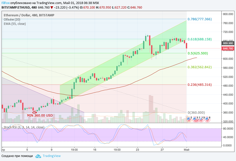 Ethereum вчера весь день пытался пробиться к новому апрельскому максимуму, но цену не пускал ключевой уровень сопротивления 61.8% фибо (688.15 USD). Таким образом максимум апреля навсегда сохранился на отметке 711.70 USD, а цена откатилась к уровню поддержки 50% фибо (625.50 USD). Сегодня над этим уровнем цена на эфир постарается закрепиться, но если объёмы продаж будут продолжать расти, то очередным уровнем поддержки эфира будет зона средних цен, которая находится в области скользящей средней EMA55 (590.00 USD).