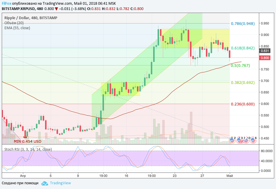 Ripple вчера находился в желтой зоне консолидации, но в завершении дня цена пробила нижнюю границу желтого диапазона и пыталась протестировать скользящую среднюю EMA55. На текущий момент рипл приостановился в области цен 0.800 USD и допивает утренний кофе. Полагаем, что сегодня паре XRP/USD окажет поддержку уровень 50% фибо (0.767 USD) и рипл сможет консолидироваться над этим уровнем поддержки.