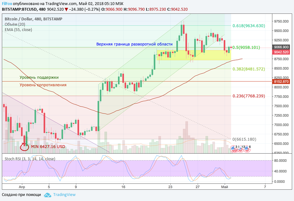 Цена Bitcoin вчера вошла в желтую зону консолидации, но протестировать нижнюю границу прямоугольника не получилось. При очень маленьких объёмах покупок курс BTC стабилизировался на уровне 50% фибо (9058.00 USD).