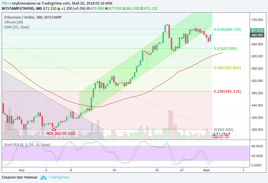 Ethereum первого мая установил дневной минимум на подходе к уровню 50% фибо (625.50 USD), но ещё продолжает консолидацию между 50% и 61.8% уровнями фибоначчи. Сегодня довольно вероятно снижение к уровню скользящей средней EMA55, которая проходит в области цен 600.00 долларов за эфир.