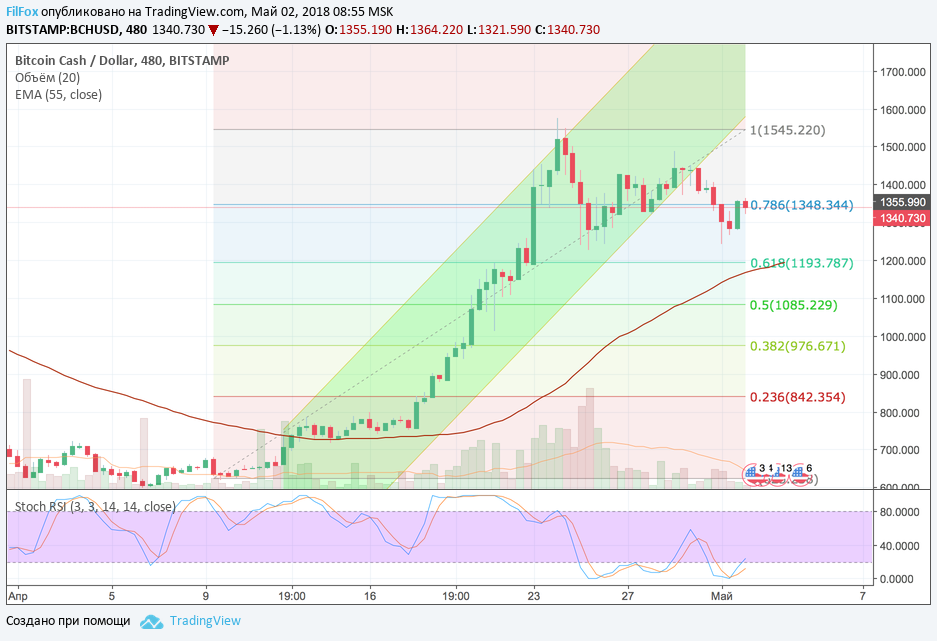 Несмотря на то, что Bitcoin Cash первого мая установил локальный минимум на отметке 1 242.00 USD, цена находится пока в стадии консолидации возле уровня 78.6% фибо (1346.81 USD). На сегодня предполагается продолжение боковика в области этого уровня фибоначчи.