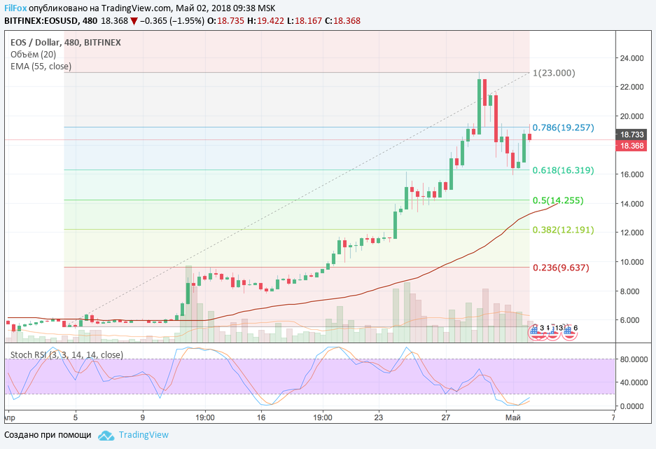 После абсолютного максимума 23.029 USD цена EOS существенно откатилась в область 16 долларов за монету, но вчера цена демонстрировала положительную динамику и утром пыталась пробить сопротивление 78.6% фибо (19.223 USD). Похоже, что сегодня рубеж в 20 долларов может оказаться в недосягаемости для EOS и цена вновь будет ре-тестить уровень 61.8% фибо (16.291 USD)
