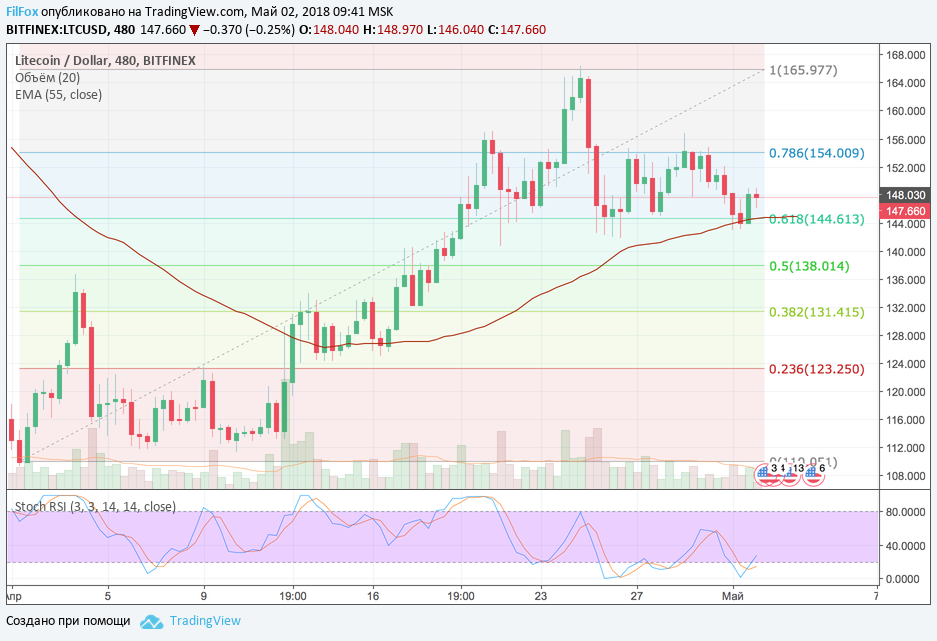 Litecoin вчера пытался консолидироваться в боковом диапазоне, и после того как цена протестировала поддержку уровня средних цен EMA55 (144.00 USD), стохастик выдал сигнал на покупку. Курс LTC подобрался к отметке 150.00 USD, но подозрительно малые объёмы не дают нам уверенность, что пара LTC/USD способна сегодня закрепится на этом рубеже.