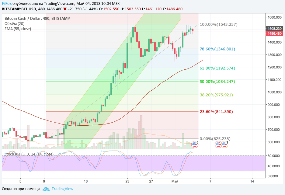 Bitcoin Cash вчера консолидировался под уровнем 100% фибо (1543.26 USD) и никак не хотел просаживаться ниже 1450.00 USD. Однако стохастик уже сформировал сигнал на продажу и цена BCH постепенно снижается. Возможно, что вчерашний прогноз снижения цены к уровню 78.6% фибо (1346.81 USD) реализуется сегодня.