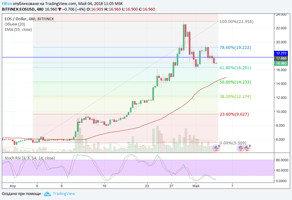 Вчера при снижении EOS к уровню поддержки 61.8% фибо (16.291 USD) возле отметке 17.777 USD цена неожиданно притормозила и легла на бок. Сегодня снижение к этому уровню поддержки продолжилось и пока не понятно, протестирует ли его цена в итоге или вновь вернётся к отметке 17.777 USD. Показания стохастика в зоне перепроданности сигнализирует о достижении локального минимума и о начале восстановления цены.