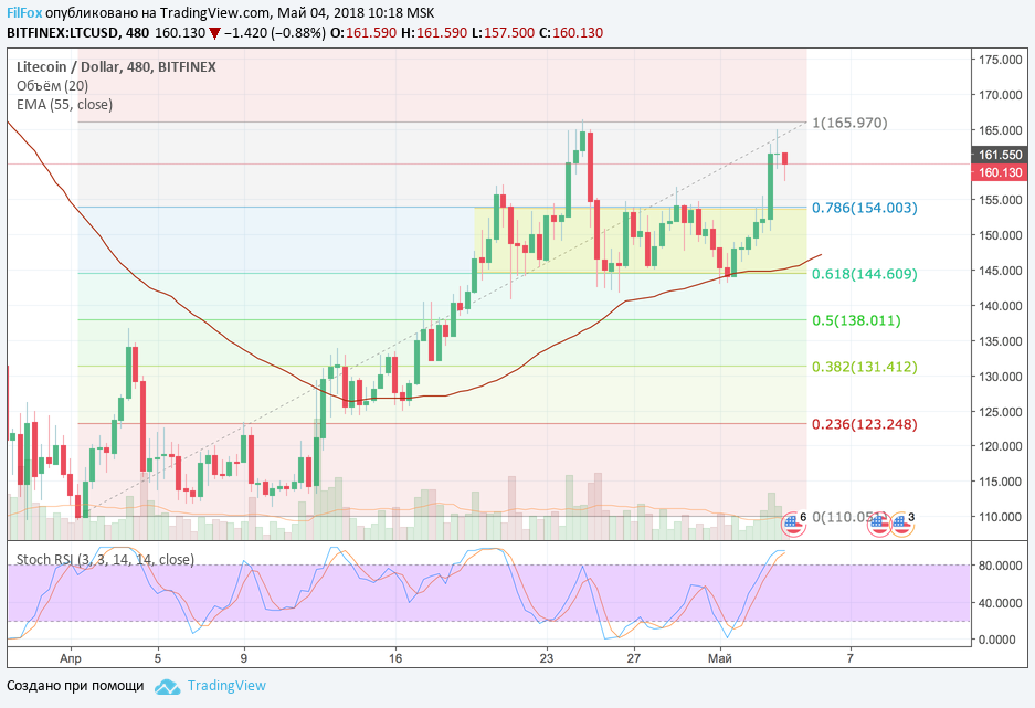 Вчера Litecoin пробил верхнюю границу желтого диапазона на уровне 78.6% (154.00 USD) и пытался протестировать 100% уровень фибо (165.97 USD). Попытка закончилась максимумом ровно на 165 долларах. Сегодня, после небольшого отката, попытка ре-теста повторится. Несмотря на то, что стохастик уже находится в зоне перекупленности, цена LTC попробует консолидироваться чуть выше этого уровня.