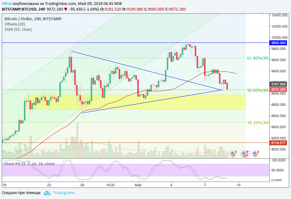 После минимума в точке 9175.00 USD и консолидации в районе EMA55 (9400.00 USD) медведям всё-таки удалось проколоть паттерн Вымпел. На уровне 50% фибо (9058.00 USD) находится сильная поддержка, оберегаемая быками. Но сегодня, возможно, её удасться продавить и цена BTC окажется в желтом коридоре, в котором просматривается сразу два сильных уровня поддержки - 8900.00 USD и 8700.00 USD. Сможет ли цена в этот раз удержаться в желтом коридоре - пока не ясно, но ранее пара BTC/USD частенько консолидировалась в этом диапазоне.