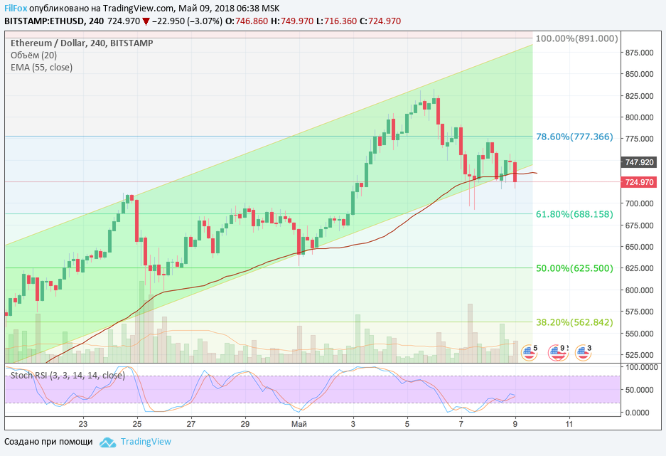 Вчера цена Ethereum восстановилась к уровню 78.6% фибо (777.36 USD), но по законам жанра этот уровень сопротивления развернул цену и она вновь отправилась искать поддержку в районе средних цен, на кривой EMA55 (720.00 USD). Опираясь на поддержку скользящей средней, цене на эфир вчера удавалось удержаться в границе зелёного коридора роста. Но сегодня медведи продавили цену ниже, и похоже, что в течение дня нас ожидает ре-тест уровня поддержки 61.8% фибо (688.16 USD)