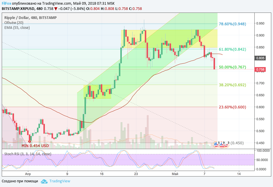 Ripple вчера используя поддержку скользящей средней, восстановился к уровню сопротивления 61.8% фибо (0.842 USD). Но преодолеть его или закрепиться под ним - цене так и не удалось. Небольшие по объёму продажи сбили цену на рипл до 50% уровня фибоначчи (0.767 USD). Надеемся, что в этой области цена сможет зацепиться за этот уровень поддержки и немного консолидироваться.