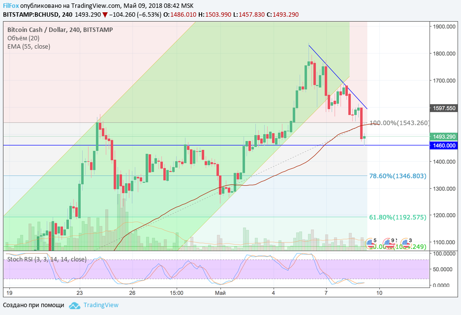 Вчера, во время ре-теста уровня 100% фибо (1543.26 USD), цена Bitcoin Cash встретила поддержку и немного консолидировалась над ним. Но сегодня утром этот уровень поддержки был сломлен и пара провалилась к уровню консолидации 1460.00 USD. В коридоре между этими двумя уровнями, на прошлой неделе, пара консолидировалась почти три дня, прежде чем смогла установить максимум 1838.00 USD.