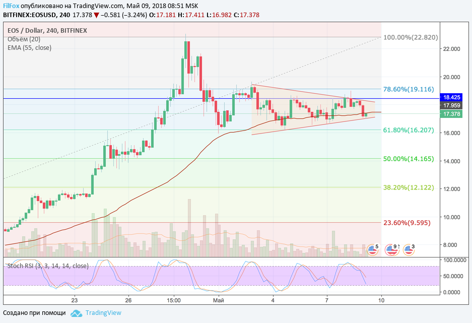 Цена на токены EOS продолжает консолидироваться, сужая диапазон. Вчера цена проколола уровень 18.42 USD, но так же быстро вернулась в пределы диапазона. Главной поддержкой, внутри этого диапазона, является скользящая средняя EMA55, которая и удерживает цену EOS в боковике.