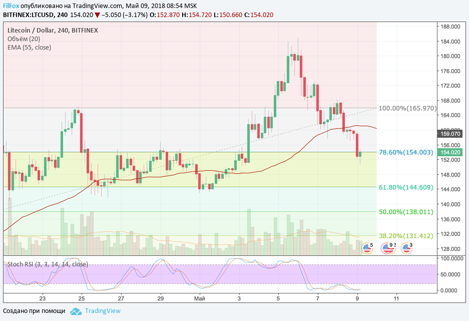 Как мы вчера и предполагали цена Litecoin достигла уровня 78.6% фибо (154.00 USD) и попала в широкий желтый коридор консолидации, где провела большую часть времени за последние две недели.