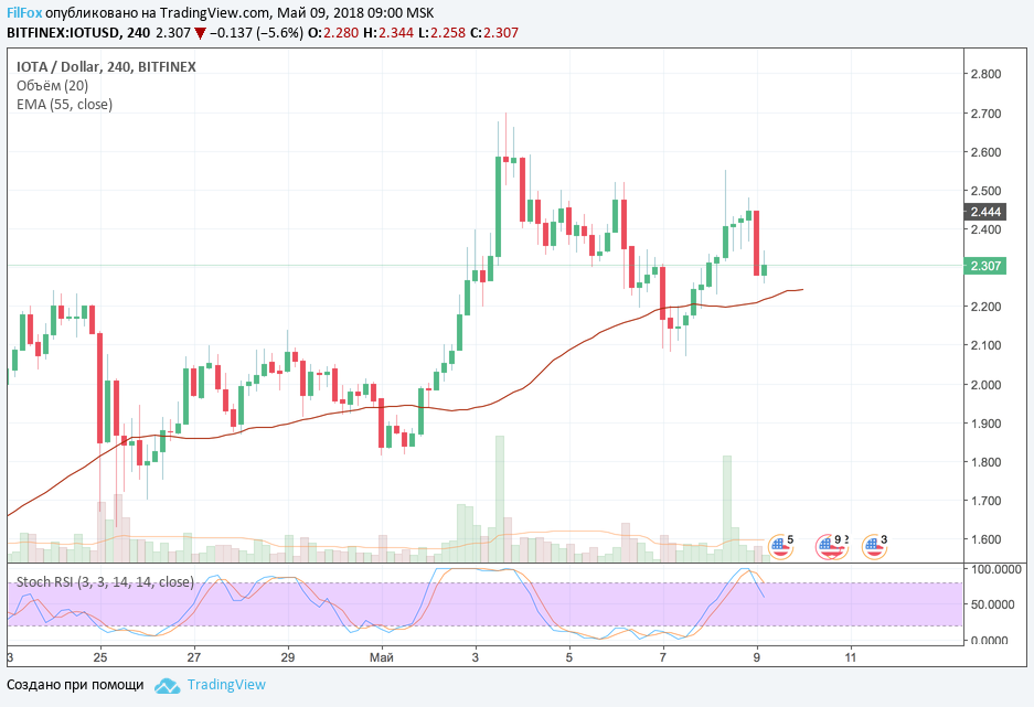 Чуть ли не единственная пара, которая вчера проигнорировала общее негативное настроение рынка это IOTA /USD. На четырёхчасовом тайм-фрэйме за вчерашний день нет ни единой красной свечи! И только сегодня на графике цены появилась красная свеча, по которой цена IOTA спустилась к уровню поддержки 2.262 USD. Полагаем, что в дальнейшем скользящая средняя EMA55, проходящая в районе цен 2.200 USD не пропустит цену ниже. Если стохастик от этого уровня покажет сигнал на покупки, то можно открывать длинные позиции с целью роста, в среднесрочной перспективе, в район 2.900 USD.