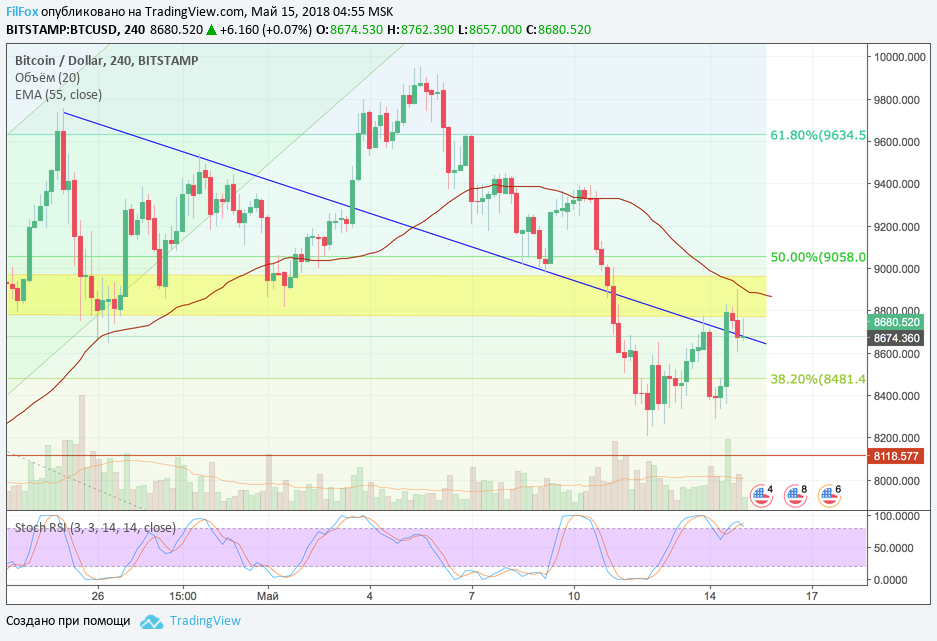 Вчера мы видели как кардинально поменялись настроения на рынке с началом криптовалютной конференции Consensus 2018. В первой половине дня цена Bitcoin падала в пределах диапазона 8710.00 - 8280.00 долларов США, но во второй половине - полностью восстановилась выше синей линии даун-тренда.