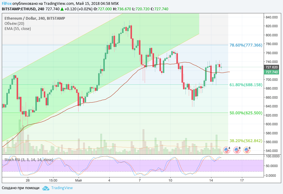 Аналогичная ситуация неопределённости была вчера и с ценами на Ethereum. От уровня открытия 730.00 USD падение продолжалось до уровня поддержки 61.8% фибо (688.16 USD). После этого цена вновь установила максимум на отметке 742.45 USD. Сегодня на четырёхчасовом графике стохастик прогнозирует снижение цены к уровню поддержки 61.8% фибо (688.16 USD), а на восьмичасовом тайм-фрэйме сигнал на снижение ещё не сформирован, хотя возобновление снижения тоже выглядит довольно вероятным.