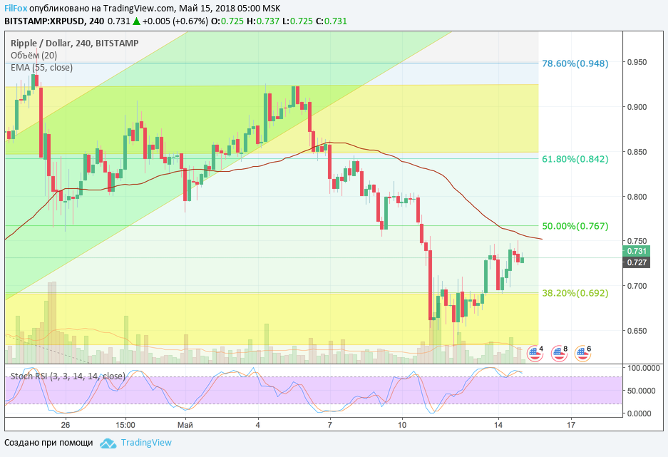 Ripple вчера тоже несколько раз менял направление движения, и в итоге волатильность уменьшилась, когда пара вошла в зону цен 0.730 USD за рипл. Сегодня вероятным выглядит снижение цены к поддержке 38.2% фибо (0.692 USD), но перед этим пара способна пробить уровень средних цен EMA55 и протестировать сопротивления 50% фибо (0.767 USD)