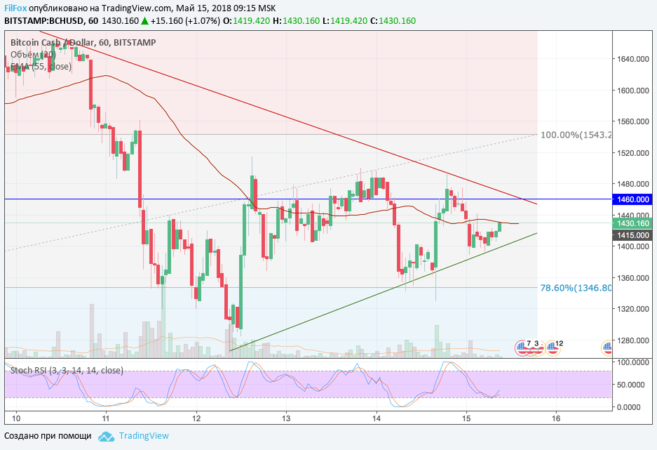 Если эта тенденция продолжится, то вполне возможно, что цена сможет пробить сопротивление красной трендовой линии, которая соединяет локальные максимумы. В результате цена Bitcoin Cash протестирует 100% фибо (1543.26 USD).