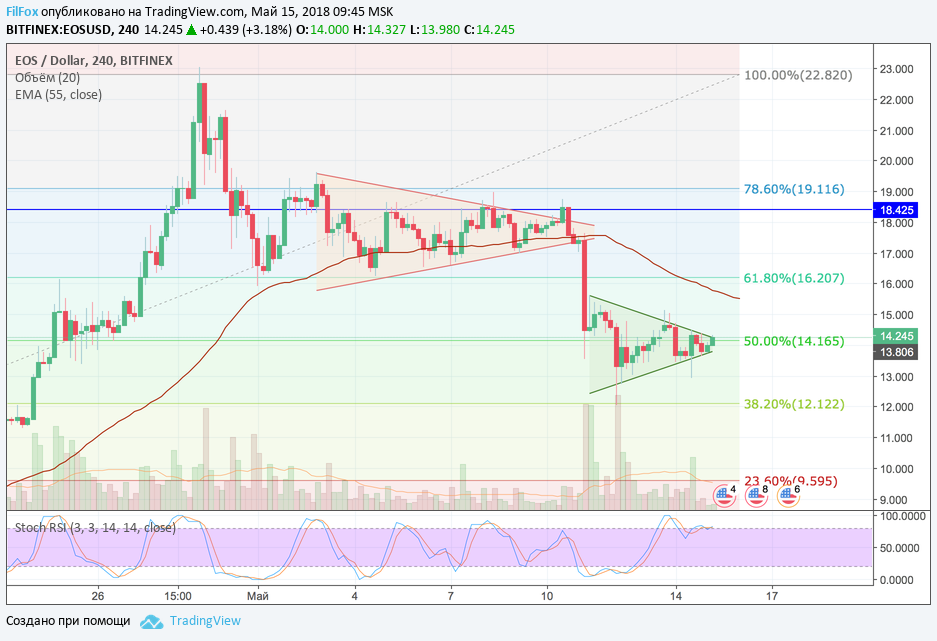Цена на токены EOS вчера консолидировалась в сужающемся диапазоне возле линии 50% фибо (14.16 USD). Сегодня ожидаем выход из диапазона и ре-тест уровня средних цен EMA55, которая на четырёхчасовом графике проходит в области 15.70 USD.