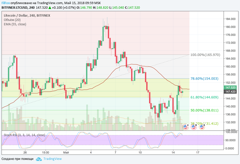 Litecoin вчера покупали достаточно в больших объёмах, так что цена восстановилась к уровню средних цен, в желтый коридор консолидации. Если сегодня объёмы сделок будут ниже средних, то цена продолжит консолидацию в желтом диапазоне, используя уровень 61.8% фибо (144.60 USD) в качестве поддержки.