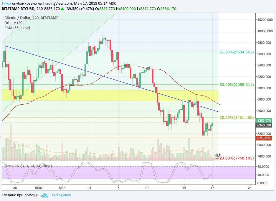 Как долго будет продолжаться консолидация вокруг уровня 8118.58 USD пока не ясно, возможно, что уже до окончания этой недели уровень 23.6% фибо (7768.10 USD) будет пробит и снижение возобновится.
