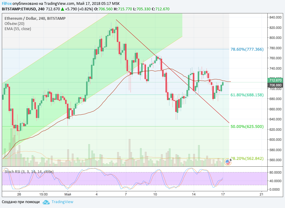 Ethereum вчера смог консолидироваться, опираясь на уровень 61.8% фибо (688.16 USD) и на откате протестировал скользящую среднюю EMA55. Как мы вчера и предполагали в своём прогнозе, объёмы торгов не увеличились, и поэтому цена эфира провела весь день в боковом диапазоне. Сегодня консолидация может продолжиться с постепенным соскальзыванием пары к красной трендовой линии снижения.