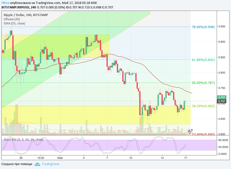 Ripple вчера консолидировался в желтом диапазоне возле верхней границы 38.2% фибо (0.692 USD), но к концу дня цене удалось преодолеть её сопротивление и закрепиться чуть выше желтого коридора. Судя по сигналу стохастика - пара XRP/USD намерена протестировать уровень средних цен, в виде скользящей средней EMA55, после чего вновь вернётся к поддержке 38.2% фибоначчи.