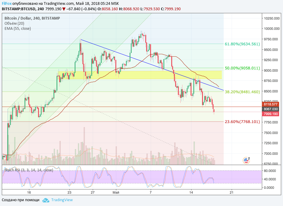 Вчера цена Bitcoin в течение дня консолидировалась над уровнем 8118.58 USD, постепенно сползая к этой поддержке. Вчера поздно ночью этот уровень поддержки был пробит и цена просела ниже 8000.00 USD. Как и прежде, полагаем, что сегодня консолидация под уровнем 8118.58 USD немного продлится.
