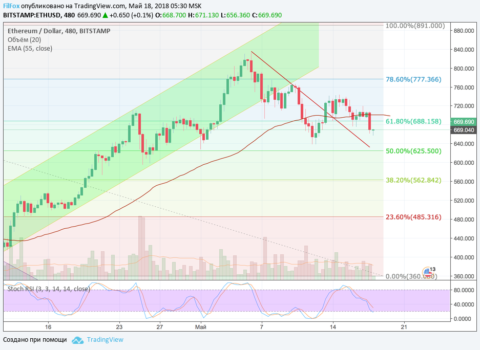Ethereum вчера консолидировался на уровне средних цен, обозначенных скользящей средней EMA55 на восьмичасовом графике. Поздно ночью цена вышла из консолидации, пробив уровень поддержки 61.8% фибо (688.16 USD).