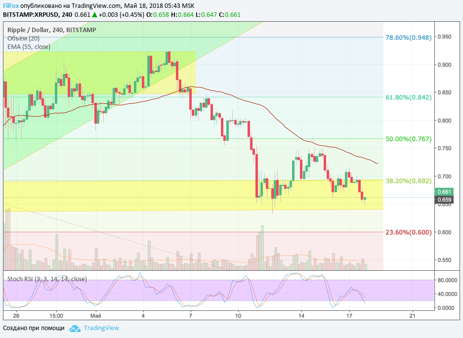 Ripple вчера консолидировался на границе желтого диапазона, возле уровня 38.2% фибо (0.692 USD). Вечером цена опустилась ниже, примерно в середину диапазона, а уже сегодня утром попыталась протестировать нижнюю границу этого диапазона (640.00 USD). Полагаем, что сегодняшняя динамика будет проходить в рамках желтого коридора.