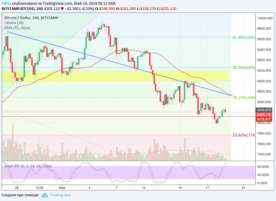 Как мы и ожидали, сильного снижения цены ниже уровня 8118.58 USD не произошло. Вчерашний минимум Bitcoin установил на отметке 7929.00 USD и восстановился выше линии 8118.58 USD. Полагаем, что до ре-теста уровня 38.2% фибо (8481.00 USD) дело не дойдёт. Консолидация в этой области «Противостояния» покупателей и продавцов ещё немного продолжится, но в ближайшее время стоит готовится к дальнейшему снижению цены к уровню 23.6% фибо (7768.00 USD).