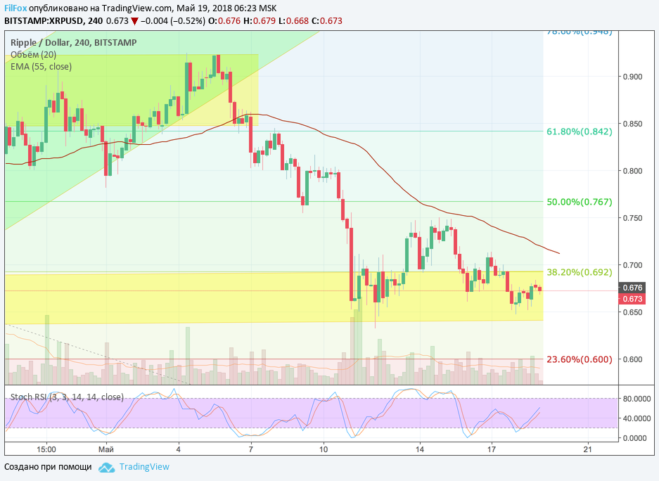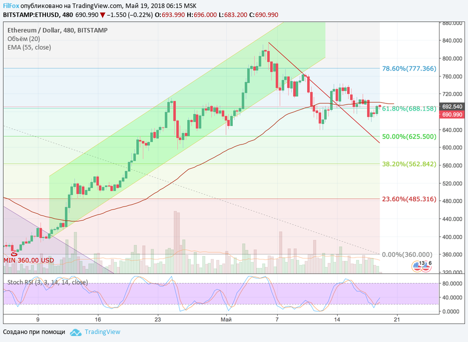 Снижение Ethereum вчера прекратилось в точке минимума 656.00 USD и в попытке ре-теста уровня средних цен, в виде EMA55, цена на эфир смогла вновь восстановится выше уровня 61.8% фибо (688.16 USD). На этих выходных скользящая средняя развернёт пару ETH/USD и отправит на ре-тест красной линии даун-тренда. Скорее всего уровень 50% фибо (625.50 USD) окажет поддержку эфиру и на короткое время отодвинет падение цены ниже красной линии нисходящего тренда.