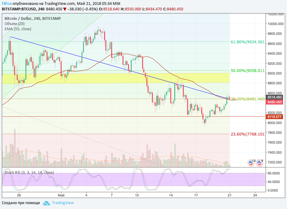 В воскресенье цена Bitcoin смогла восстановиться от дневного минимума, в районе силовой линии 8118.58 USD, до уровня средних цен. На четырёхчасовом графике кривая скользящей средней EMA55 совпадает с 38.2% фибо (8481.00 USD).