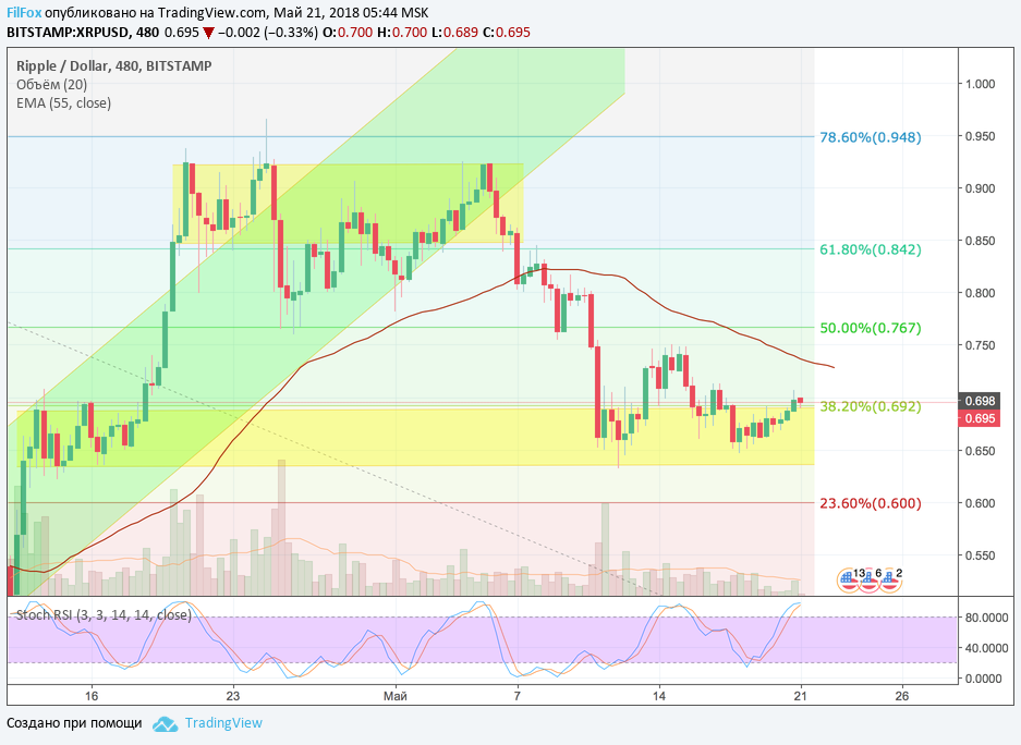 Ripple вчера, двигаясь в боковом желтом диапазоне, после ре-теста верхней границы боковика, пробил уровень сопротивления 38.2% фибо (0.692 USD) и протестировал кривую средних цен - EMA55. Сегодня цена рипл постепенно возвращается в пределы желтого коридора, в котором, скорее всего, предстоит ре-тест его нижней границы. В последний раз цена проверяла на прочность эту границу 12 мая. Тогда она оказала поддержку Ripple.