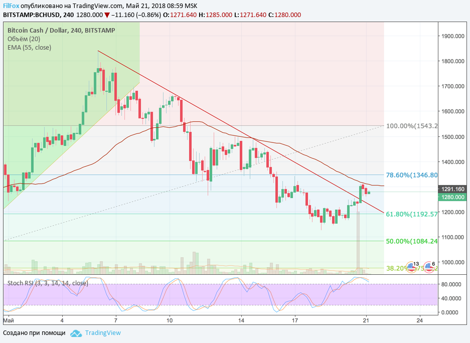В воскресенье почти весь криптовалютный рынок восстанавливался после недельного прессинга. Не был исключением и Bitcoin Cash, который вчера начал набирать рост, на средних объёмах, от уровня поддержки 61.8% фибо (1192.57 USD).