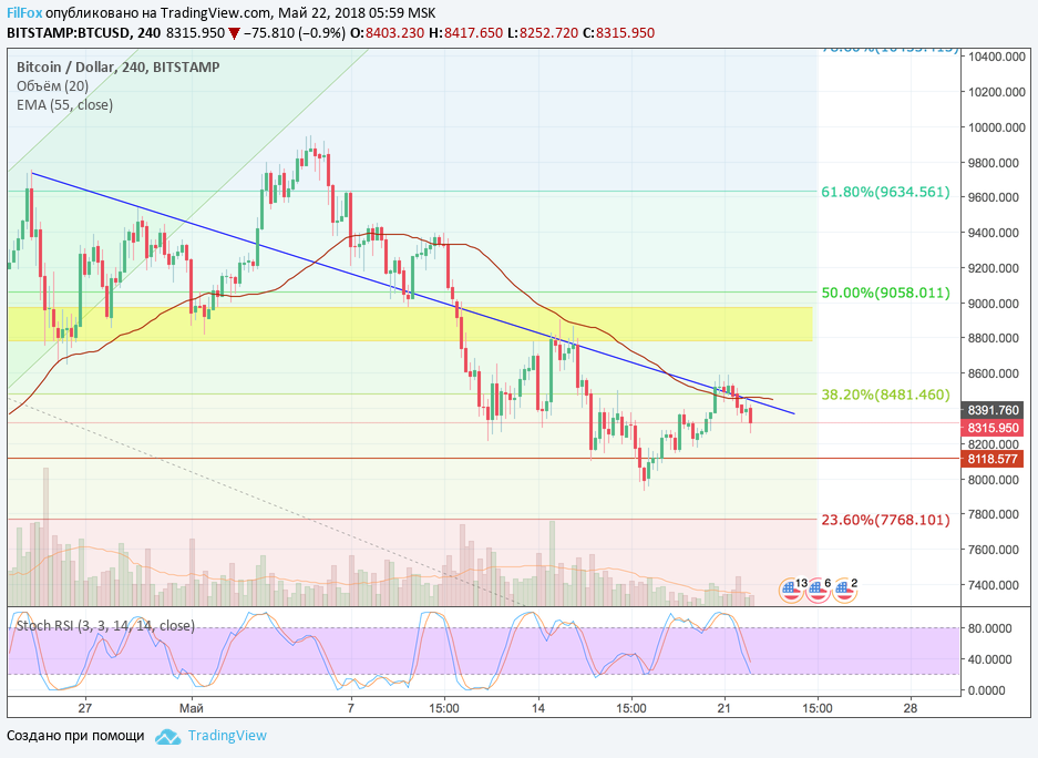 В понедельник, 21 мая, Bitcoin ещё пытался продержаться выше уровня средних цен, но обновить воскресный максимум 8590.00 USD так и не получилось. Во второй половине дня цена пробила синюю линию даун-тренда и упала ниже скользящей средней EMA55. Это говорит о том, что цена направилась к целевой отметке 8118.58 USD.