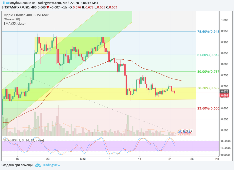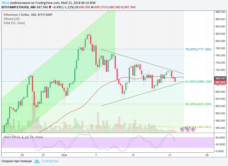 Ещё вчера в точке максимума стохастик сформировал сигнал на снижение и сегодня, очень похоже, что поддержка 61.8% фибо будет пробита. Цена пары ETH/USD направится на встречу с 50% уровнем фибоначчи (625.50 USD), выйдя из паттерна вымпел.