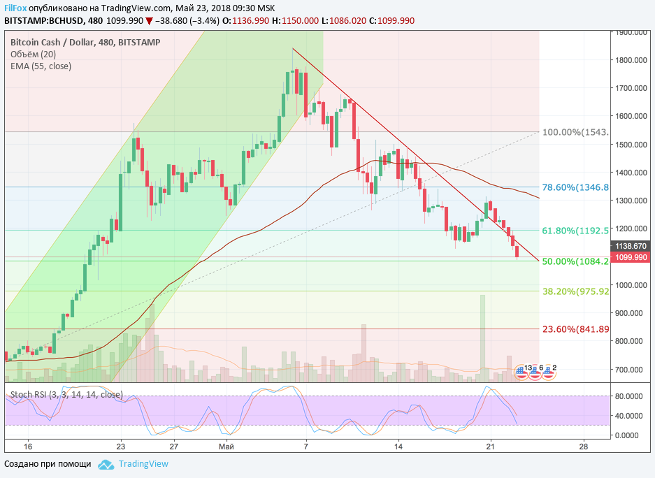 Вчера цена пробила двойную поддержку из 61.8% фибо (1192.57 USD) и красной линии даун-тренда, провалившись к уровню 50% фибо (1084.00 USD). Здесь снижение цены замедлилось, но индикатор стохастик ещё не вошел в зону перепроданности, значит Bitcoin Cash пробьёт и эту поддержку. Интересно другое, при восстановлении пары BCH/USD, выступит ли линия нисходящего тренда сопротивлением? Полагаем, что сопротивлением в этом случае, сможет выступать только пятидесятипроцентный уровень фибоначчи.