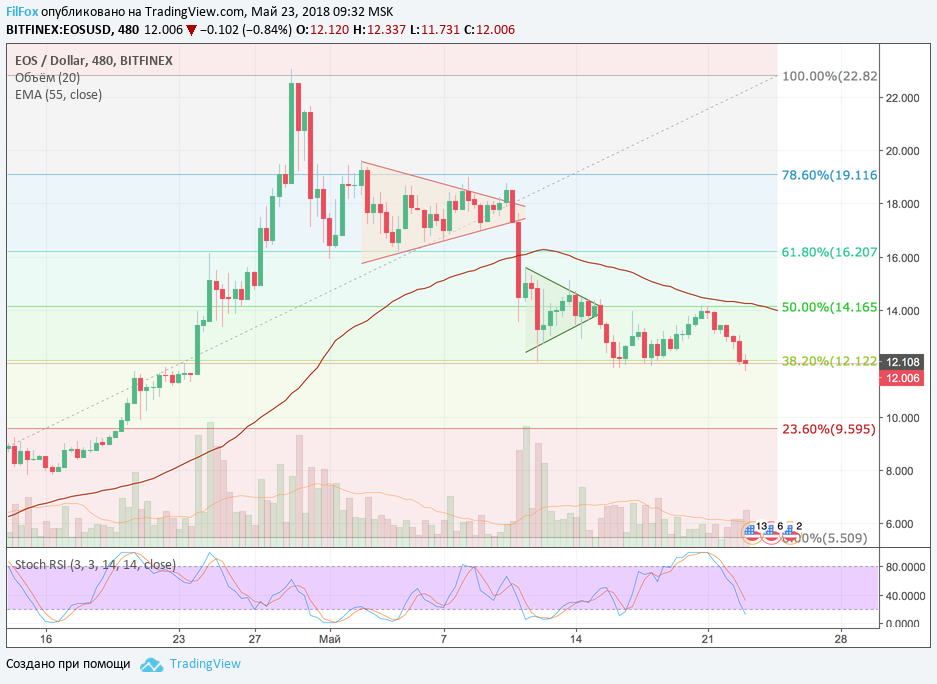 Вчера цена EOS на снижении протестировала уровень 38.2% фибо (12.12 USD) и пытается использовать его как поддержку для двух шагов вбок. Полагаем, что тут это вряд ли получится. Для движения приставным шагом вбок, EOS больше подойдёт уровень 11.22 USD. Поэтому после прорыва поддержки 38.2% фибо (12.12 USD), цена токена не должна сильно провалиться, по крайней мере сегодня.