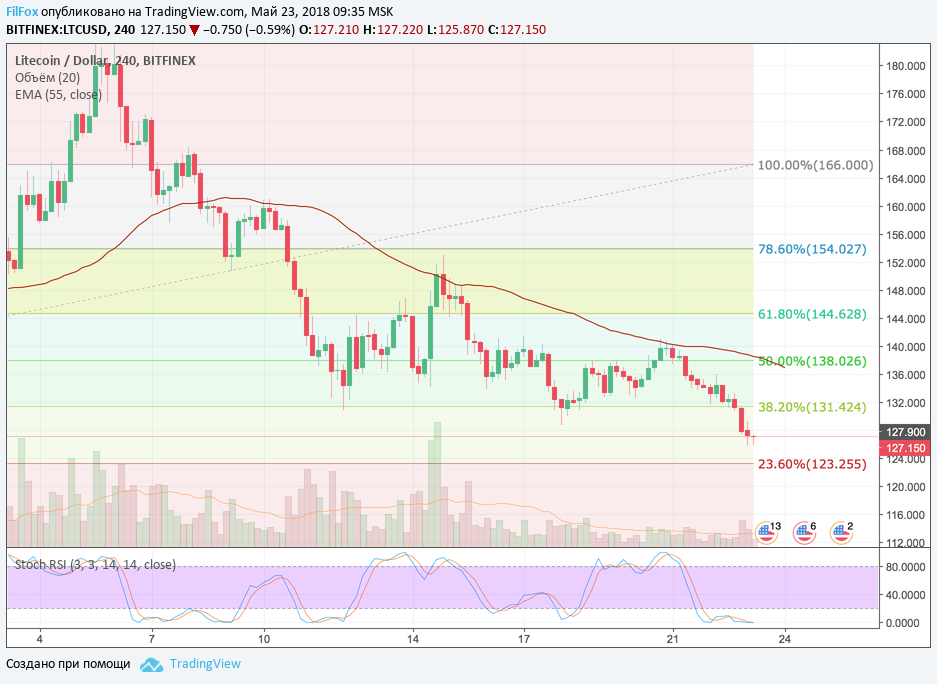 Вчера на снижении, цена Litecoin пробив уровень 50% фибо (138.00 USD), на полпути решила его вновь ре-тестить. Но попытки прекратились на отметке 136.00 USD. Под давлением медведей цена пробила уровень поддержки 38.2% фибо (131.00 USD) и сегодня уже подбирается к следующему уровню поддержки 23.6% (123.00 USD). Возможно, в течение дня, пара LTC/USD немного «покапризничает» в зоне 126 долларов, но в итоге всё равно сегодня достигнет уровня 123.00 USD.