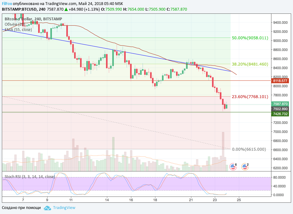 Давление медведей усилилось, объёмы продаж увеличились и цена, пробив поддержку уровня 23.6% фибо (7768.10 USD), установила майский минимум на отметке 7435.00 USD. Как видно из графика, BTC не хватило всего девяти долларов, чтобы протестировать указанный нами зелёный уровень 7426.00 USD. Началось восстановление.