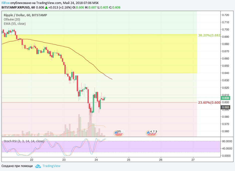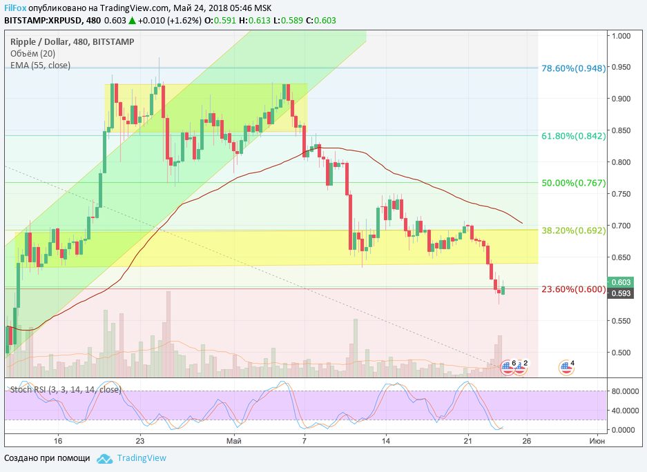 Ripple вчера проколол поддержку уровня 23.6% фибо (0.600 USD) и установил минимум на отметке 0.575 USD. На часовом тайм-фрэйме хорошо видно, что восстановление началось медленно, с задержкой на уровне фибоначчи 23.6% (0.600 USD). Из-за этого границы желтого коридора цена достигнет уже в ближайшее время.