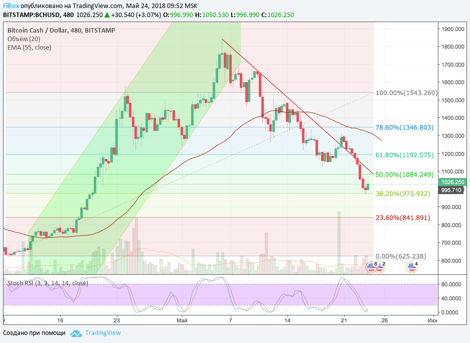 Вчера цена Bitcoin Cash на снижении протестировала уровень поддержки 38.2% фибо (975.92 USD) и установила месячный минимум на отметке 969.00 USD.