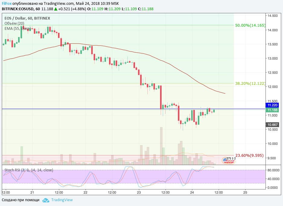 Вчера, после прорыва поддержки 38.2% фибо (12.12 USD) цена EOS достигла уровня 11.22, на часовом графике, обозначенного синей линией. Восемь часов подряд цена тестировала этот уровень двигаясь в боковом направлении, после чего смогла прорваться ниже и установить минимум в точке 10.45 USD.