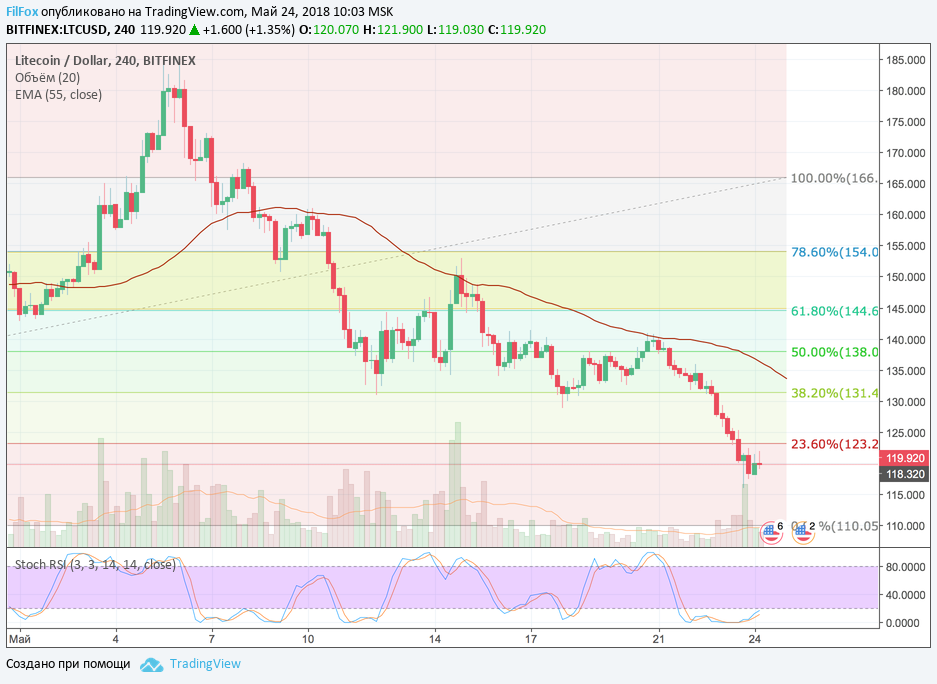 Вчера пара долго не хотела снижаться ниже 125 USD, но в итоге сильный медвежий импульс прорвал уровень 23.6% фибо (123.00 USD) и установил минимум на глубине 116.00 USD. После этого пара LTC/USD немного восстановилась в область цен 120 долларов за Litecoin, но, судя по показаниям стохастика, восстановление заканчивается и в ближайшее время снижение возобновится к нулевому уровню фибоначчи, на отметке 110.00 USD