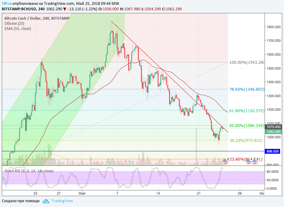Вчера цена Bitcoin Cash на восстановлении протестировала уровень сопротивления 50% фибо (1084.00 USD). Как видим стохастик находится в зоне перекупленности и даёт сигнал на продажи. Кто планировал открывать короткие позиции должны уже были это сделать, после того как основная линия стохастика %k (синяя) пересекла дополнительную линию %d (красная). Однако делать это нужно со стоп лоссами, потому что выглядит это как «классика теханализа», а это подозрительно (возможны ложные пробои).